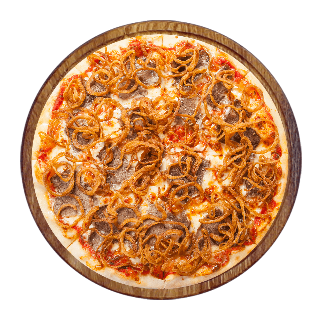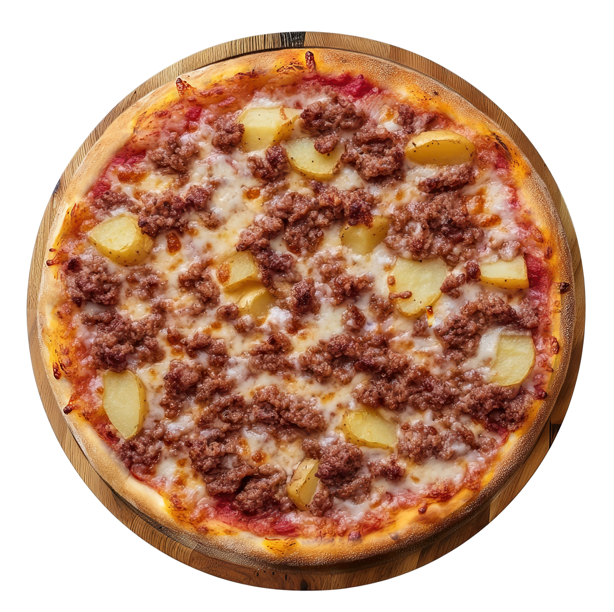 Tomate, fromage, boeuf haché, olives, poivrons, champignons.
