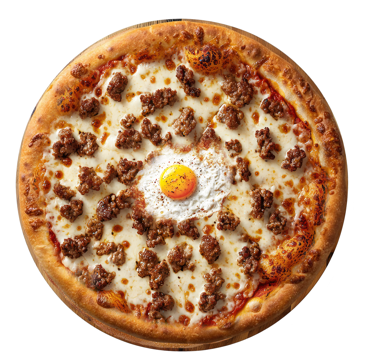 Tomate, fromage, boeuf haché, oeuf, champignons.