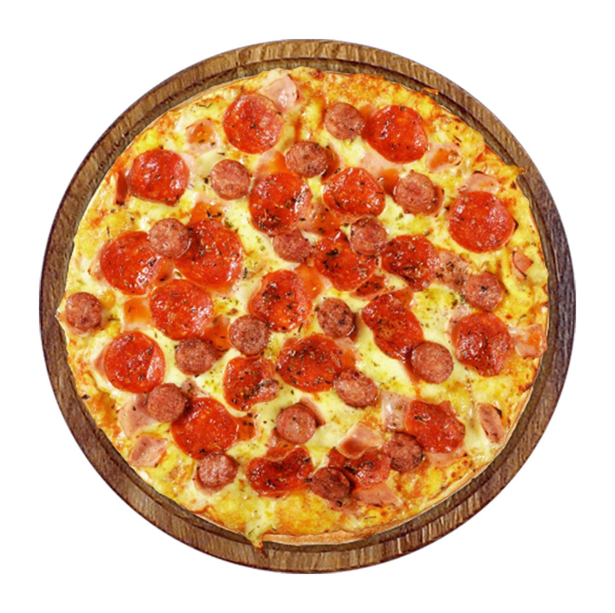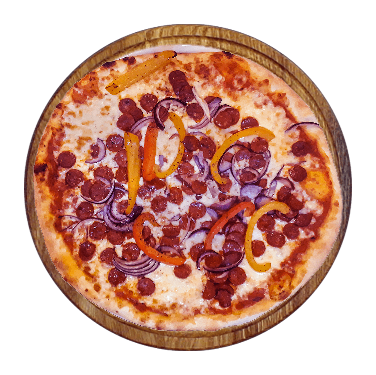 Tomate, fromage, double merguez, oignons, poivrons.
