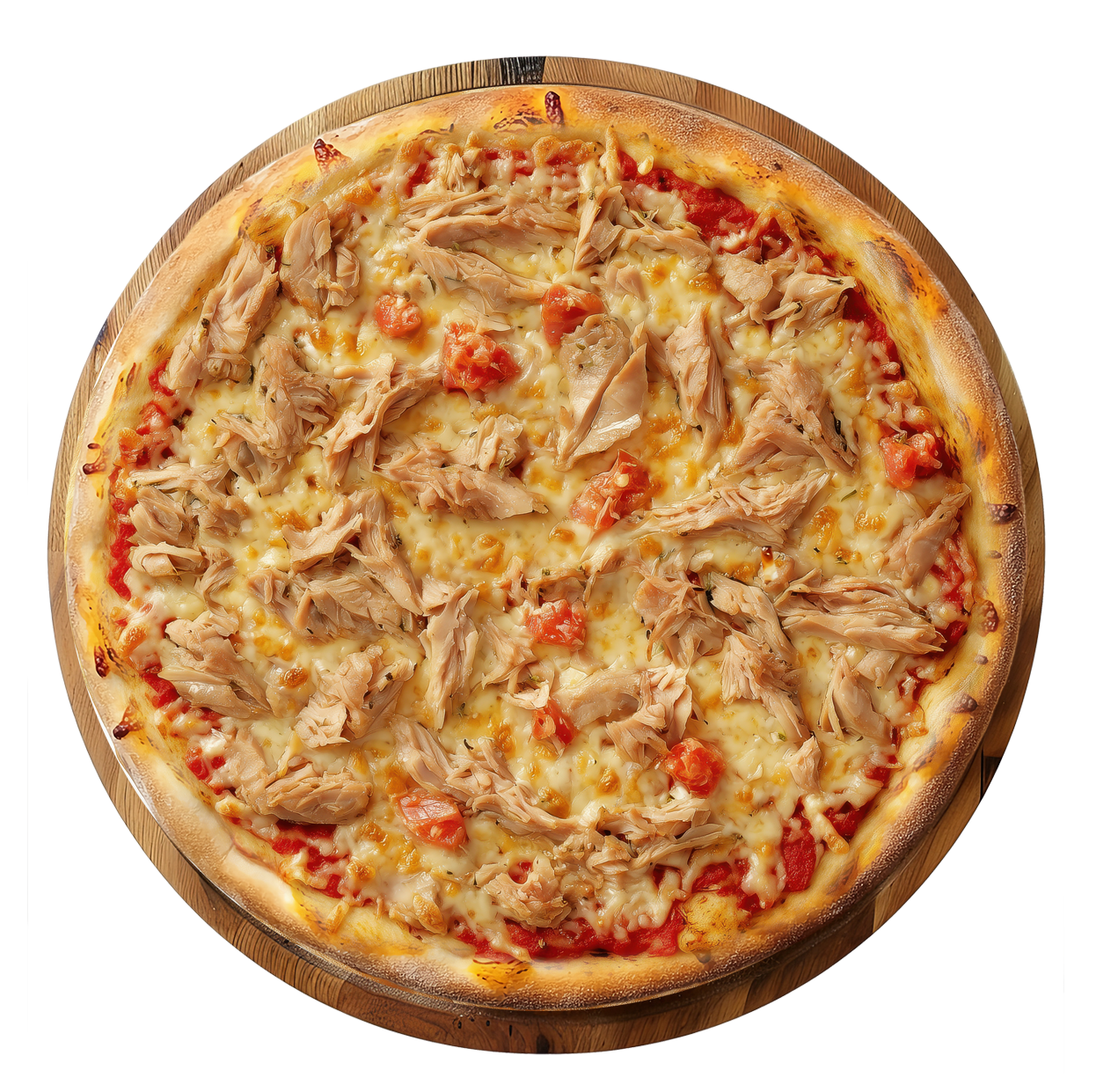 Tomate, fromage, thon, champignons, crème fraîche.