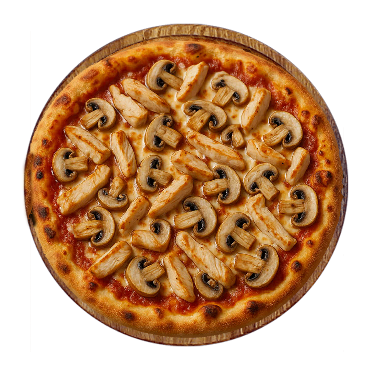 Tomate, fromage, poulet, chèvre, champignons.