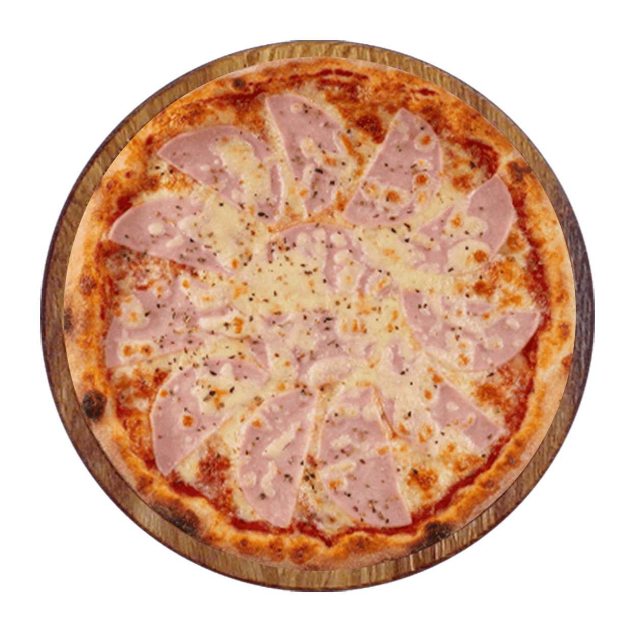 Tomate, fromage, jambon*, champignons.