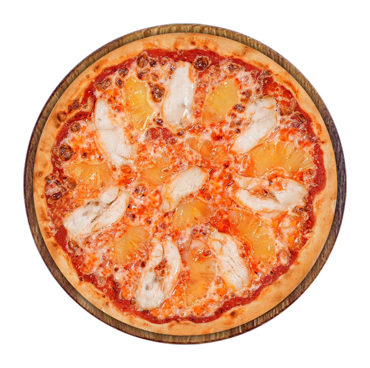 Tomate, fromage, poulet, ananas.