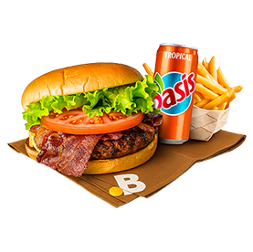 Smashed beef, cheddar, bacon, salade, tomates, oignons, cornichons, sauce maison.