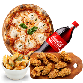 1 Pizza Familiale au choix + 12 Chicken wings ou 12 Nuggets + Potatoes ou frites + 1 Maxi coca cola.