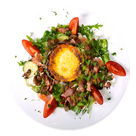 Salade verte, tomates, lardons, chèvre chaud sur toast + Pain offert sur demande.