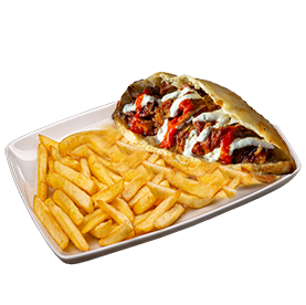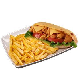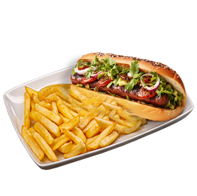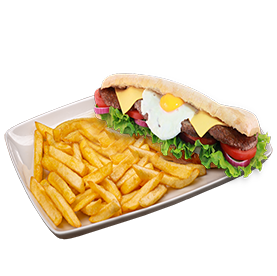 Pain au choix, 2 steaks, oeuf, cheddar + Frites.