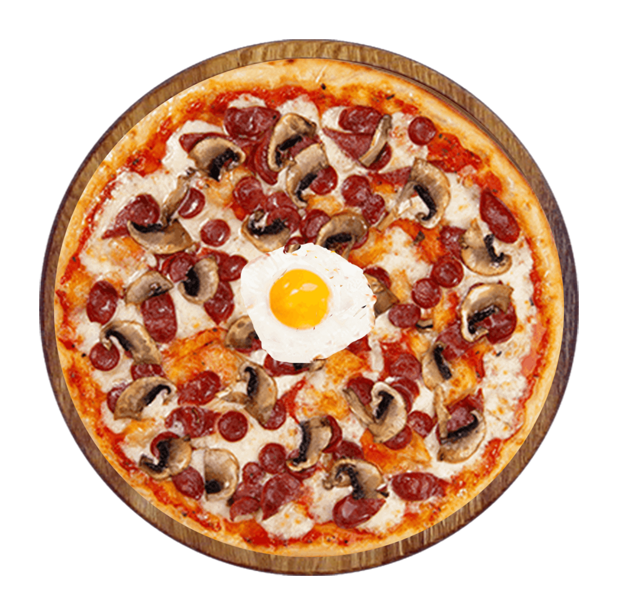 Tomate, fromage, merguez, champignons, oeuf, origan.