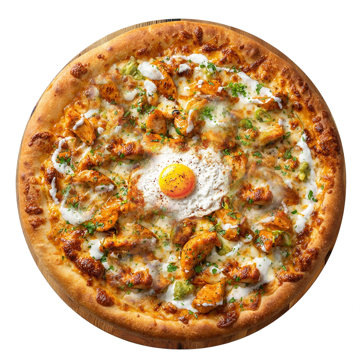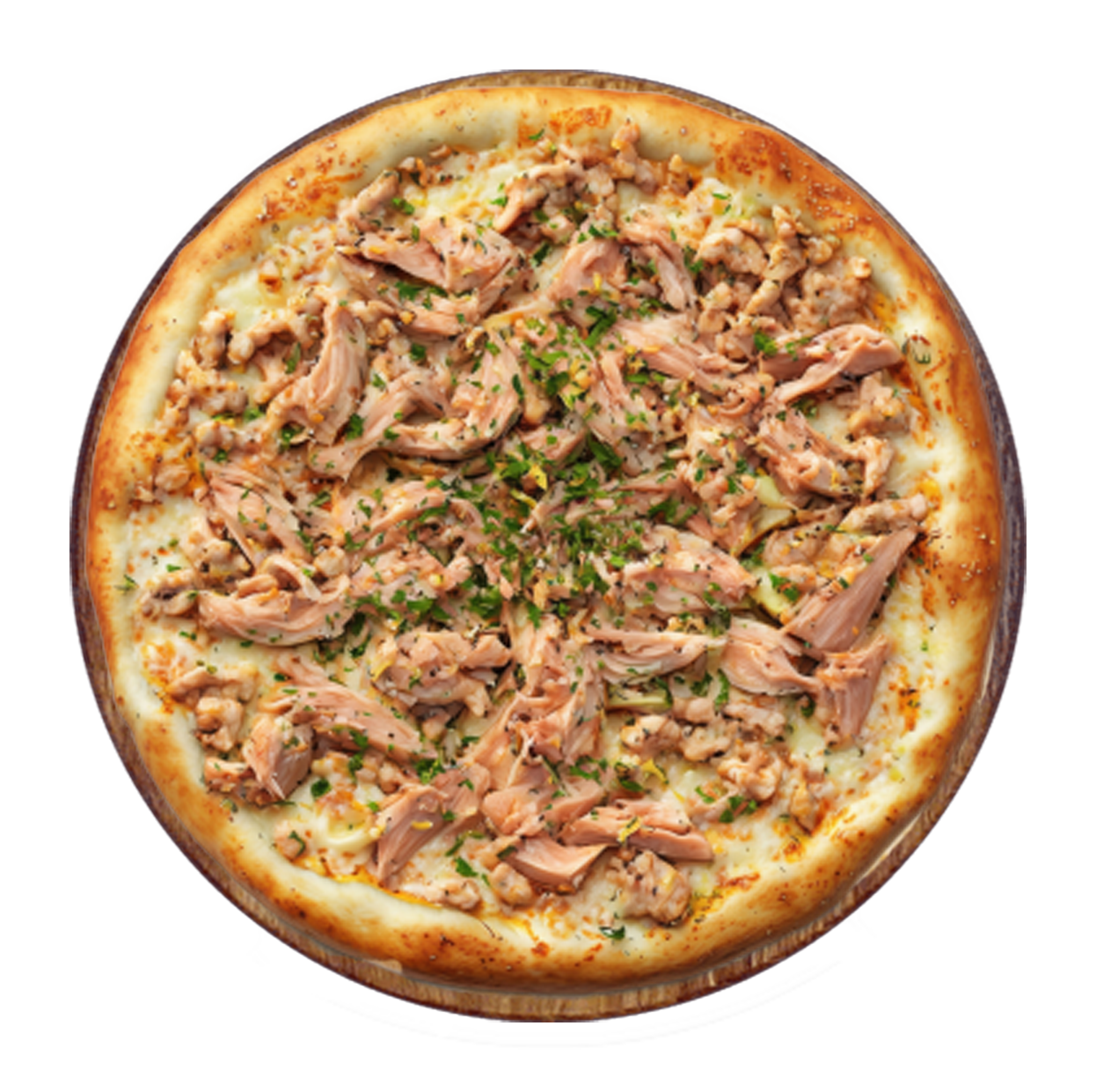 Crème fraîche, fromage, viande hachée, chorizo, poulet, oignons.