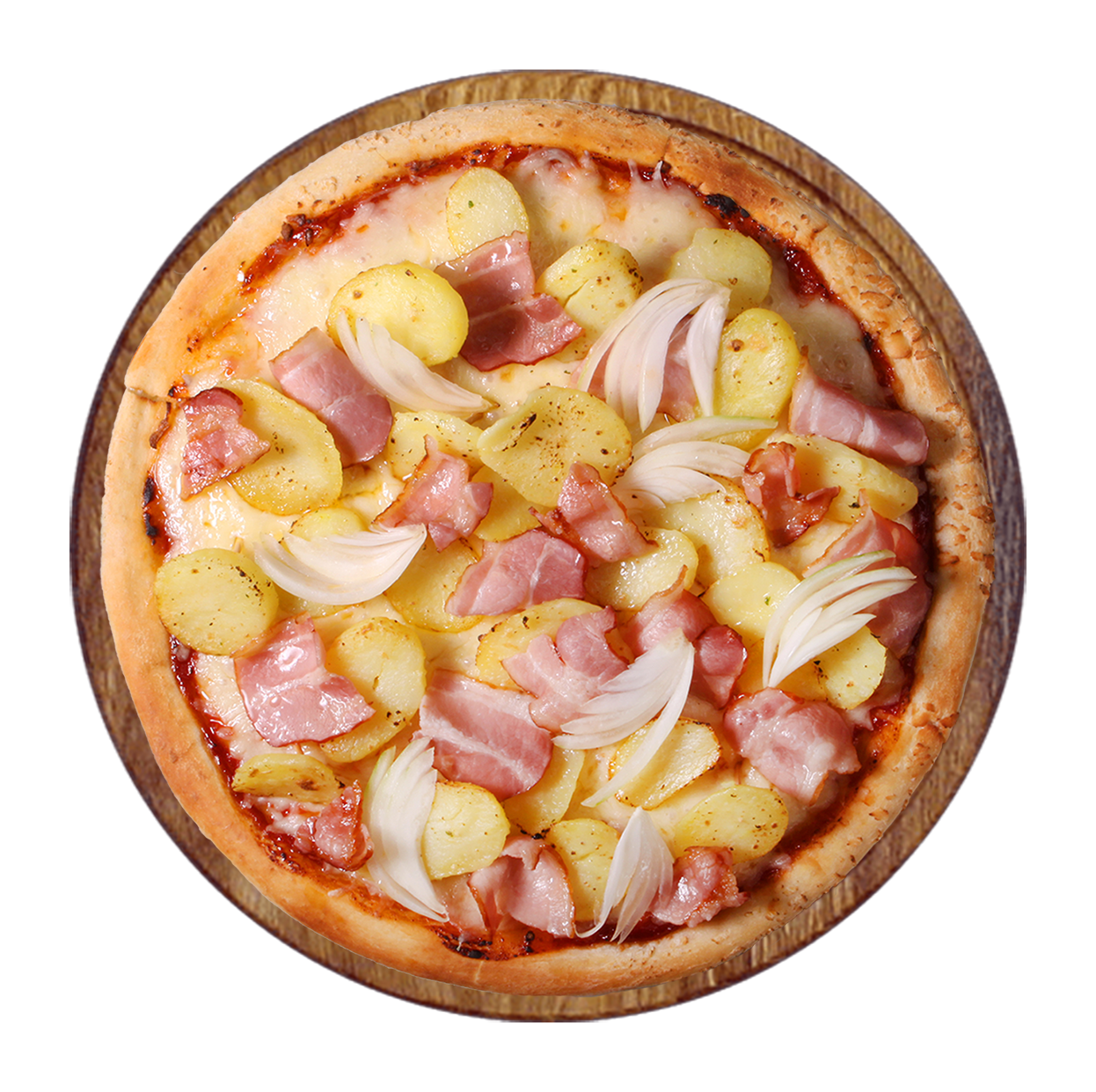 Tomate, fromage, lardons, oignons, pommes de terre.