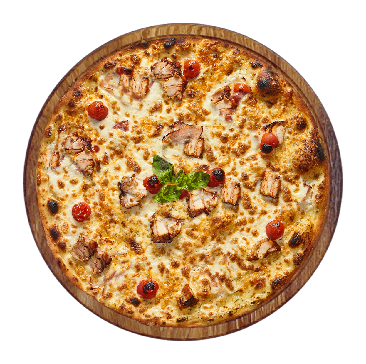 Tomate, fromage, poulet, oignons, tomates fraîches.