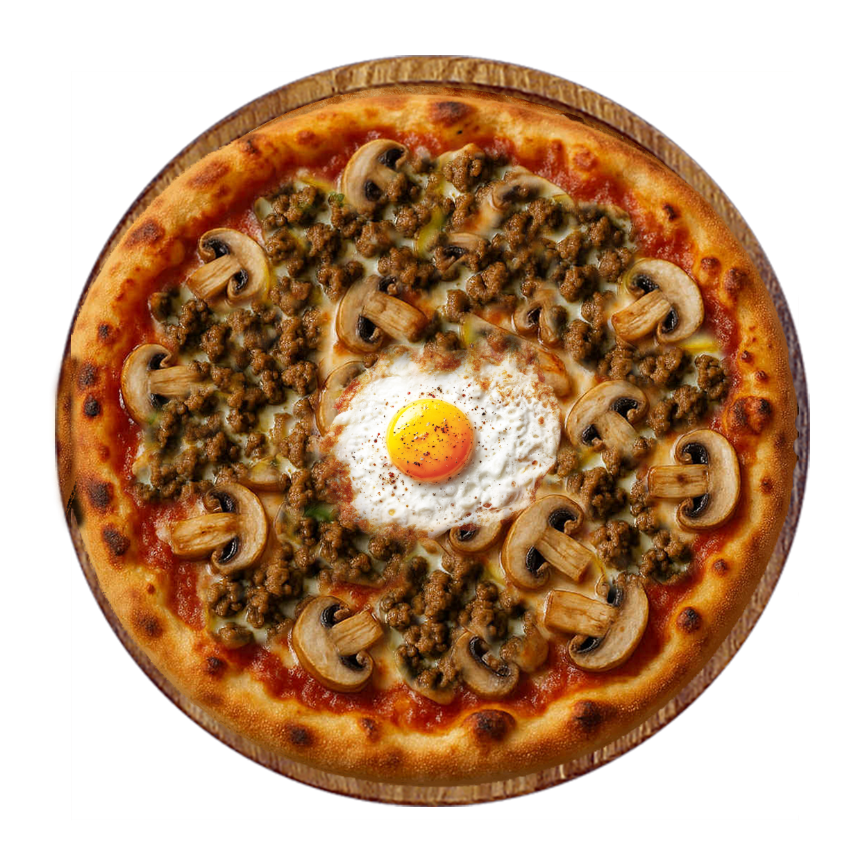 Tomate, fromage, viande hachée, champignons, oeuf.