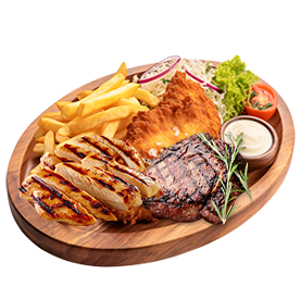 3 Viandes au choix, crudités + Frites.