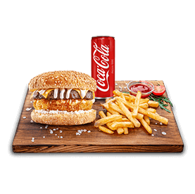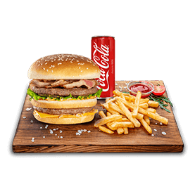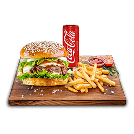 2 Steaks 80gr, cheddar, salade, tomates, oignons.