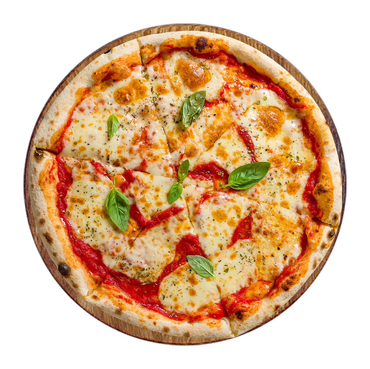 Tomate, fromage, jambon, champignons, poivrons, artichauts.