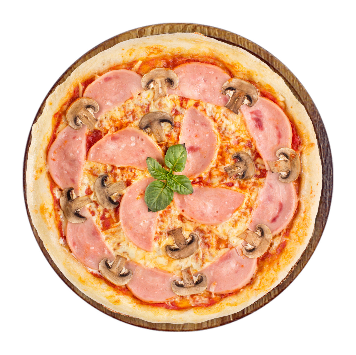 Tomate, fromage, jambon, champignons.