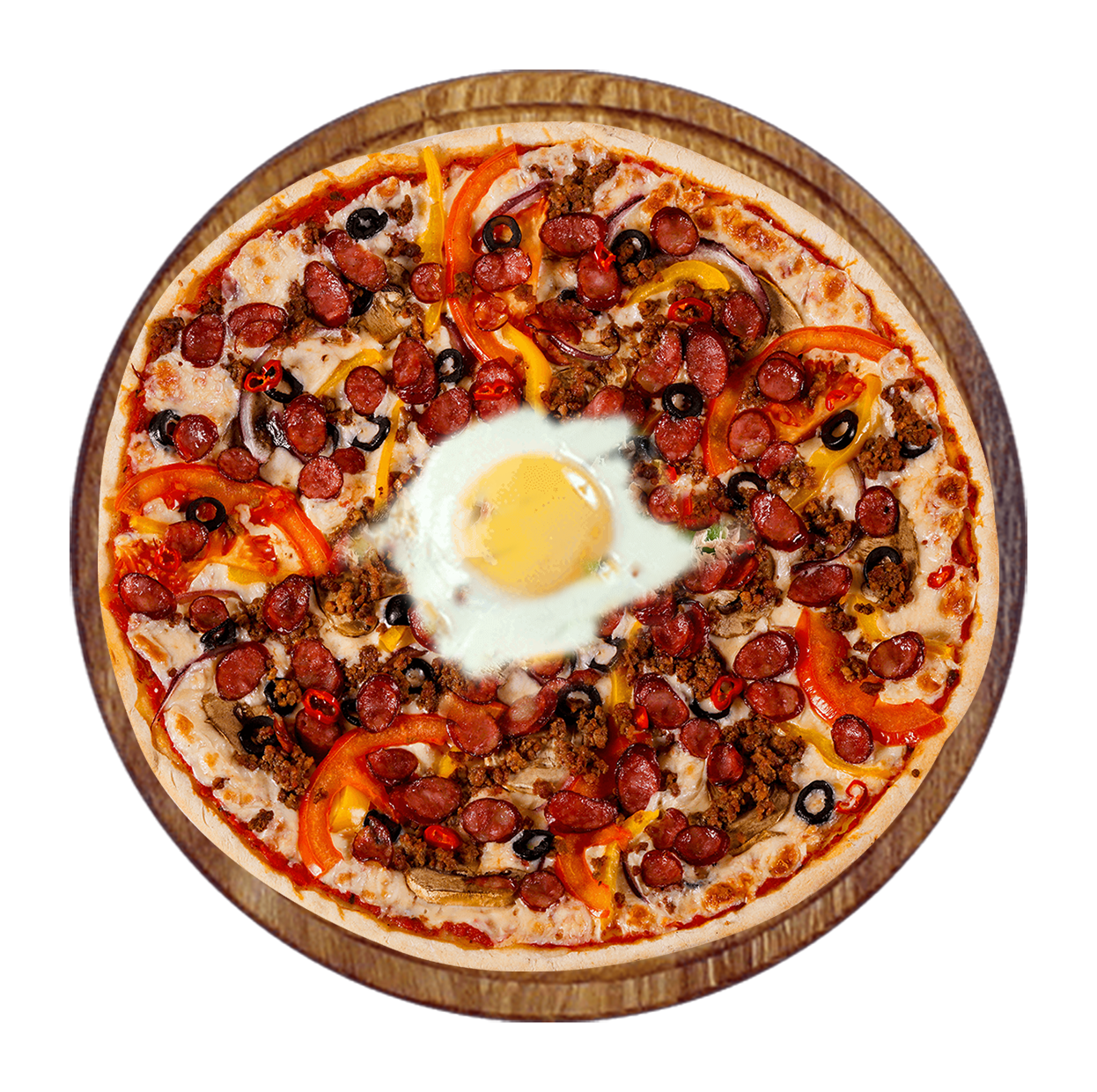 Tomate, fromage, merguez, oignons, poivrons, oeuf, olives.