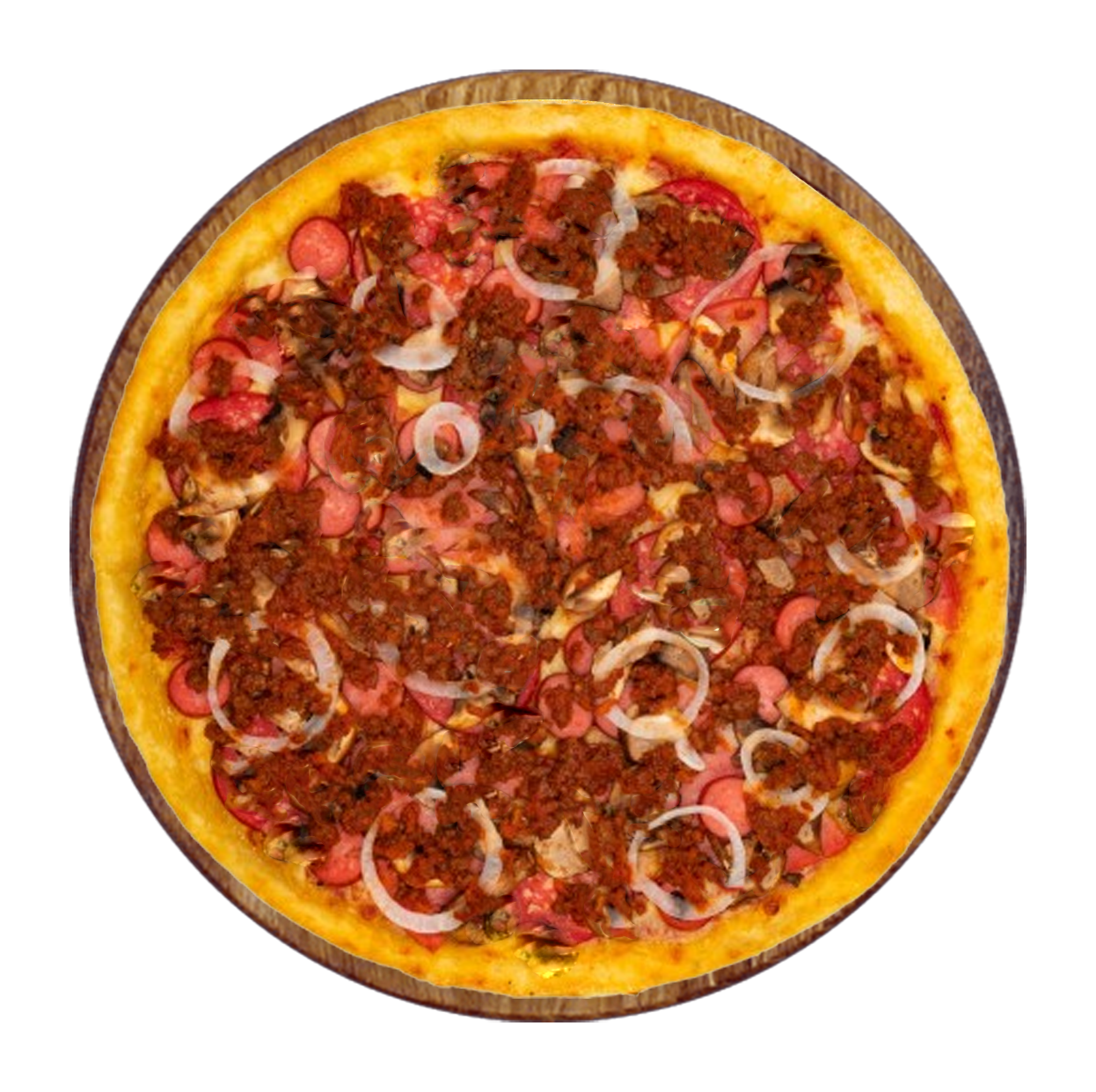 Tomate, fromage, chorizo, viande hachée, oignons, olives.