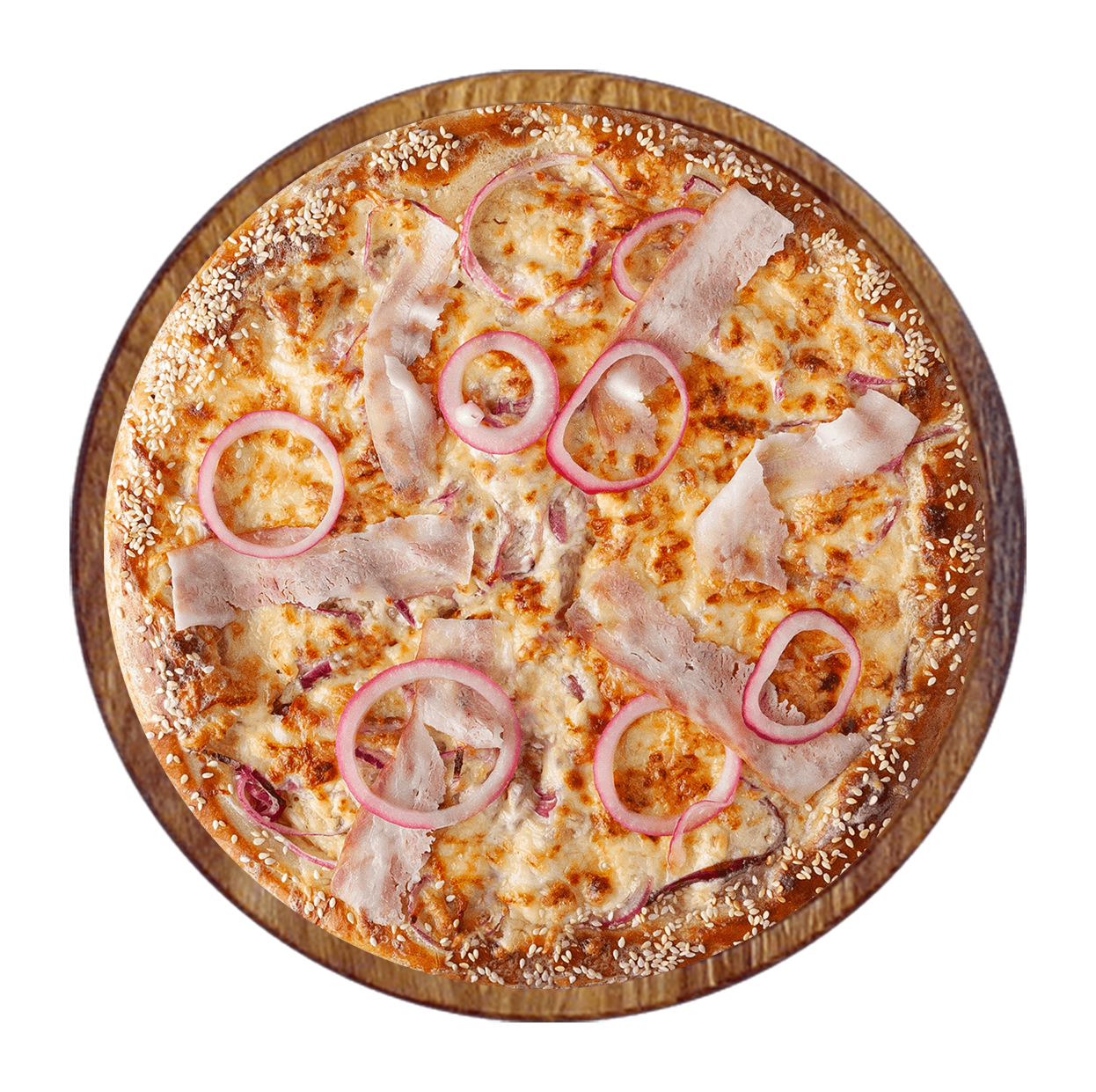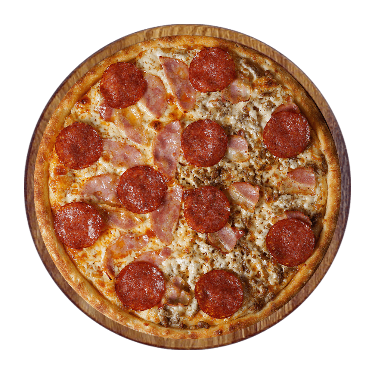 Tomate, fromage, chorizo, bâtonnets de lardons, jambon.