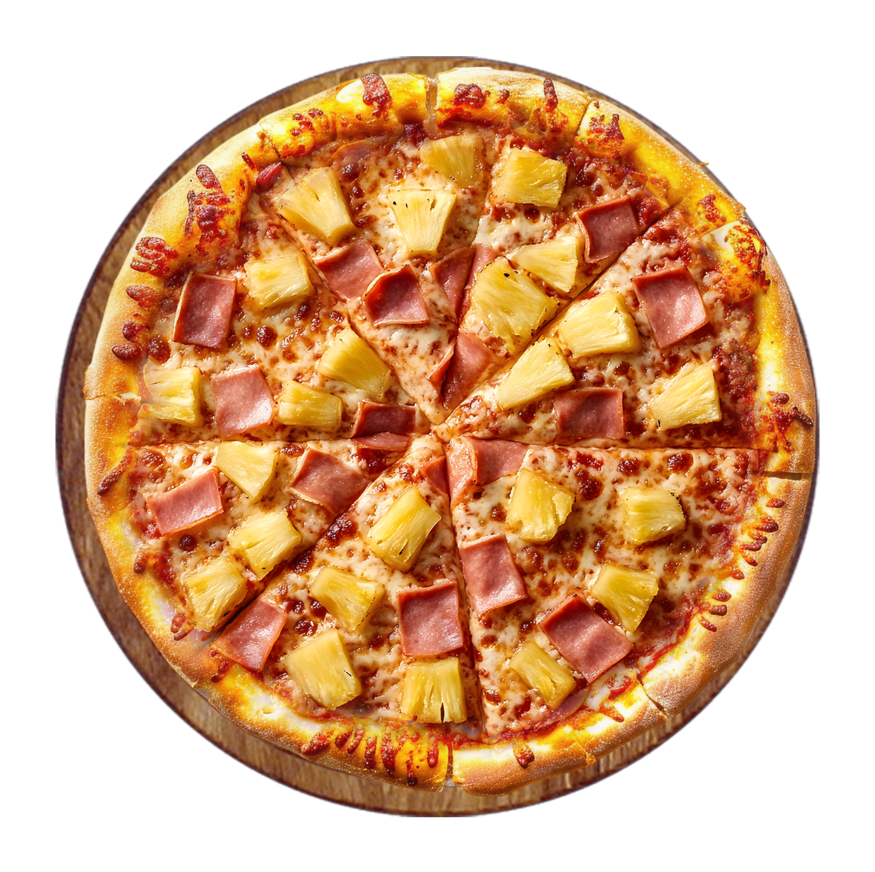 Tomate, fromage, jambon, ananas.