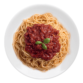 Sauce tomate maison avec viande hachée et herbes aromatiques, servie avec spaghetti al dente.