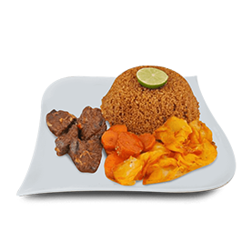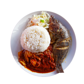 Le plat traditionnel par excellence, Riz cuit dans une sauce tomate épicée, servi avec un délicieux filet de mérou et des légumes du jour.
