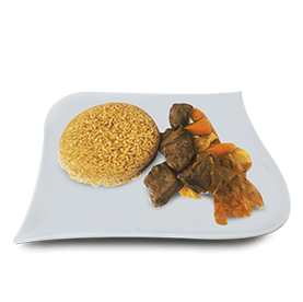 Riz mijoté dans une sauce riche et relevée, servi avec de généreux morceaux de boeuf et des légumes variés.