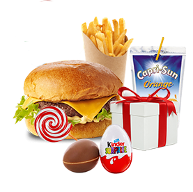 Cheese burger + Frites + Capri sun + Kinder + Jouet + Sucette.