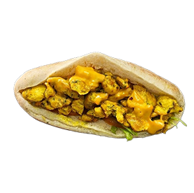 Chicken curry, sauce fromagère, galette pommes de terre, fromage. + 1 euro de plus pour frites.