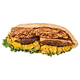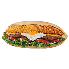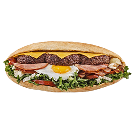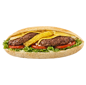 2 Steaks, oeuf, bacon, fromages. + 1 euro de plus pour frites.