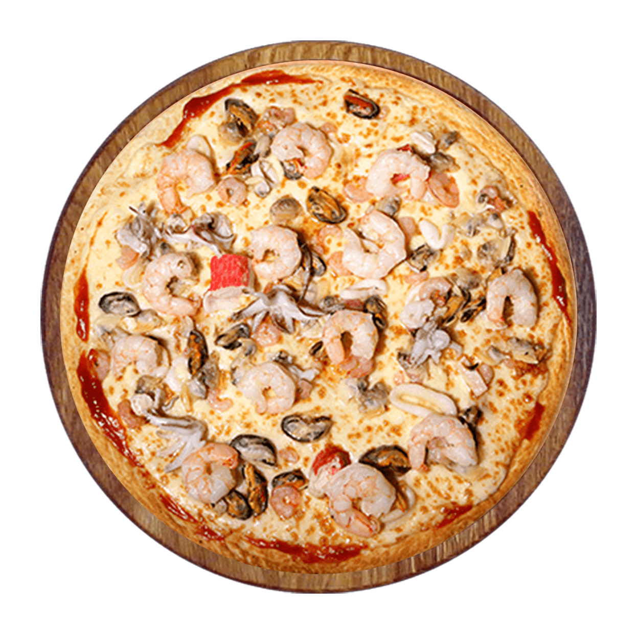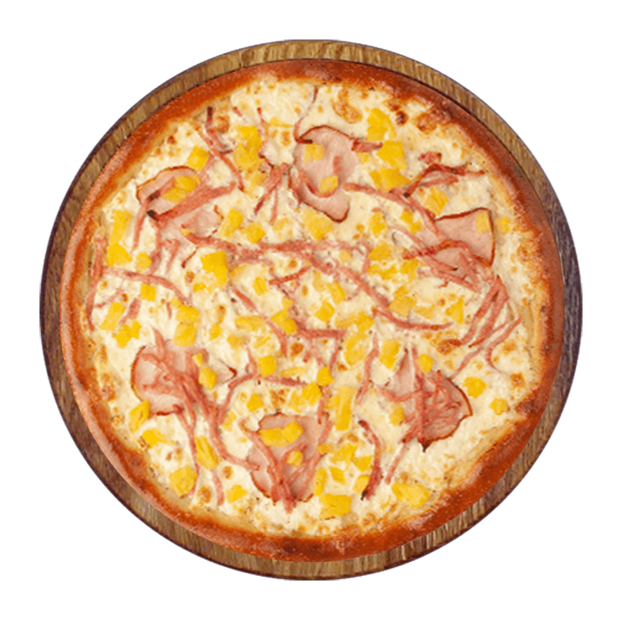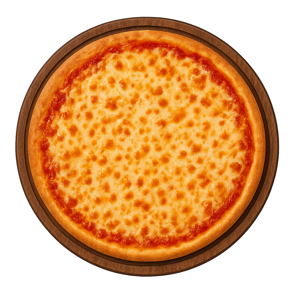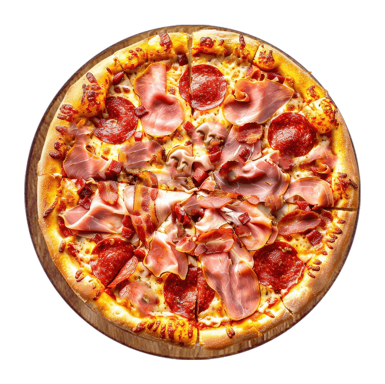 Tomate, fromage, jambon, bacon, chorizo, pepperoni.