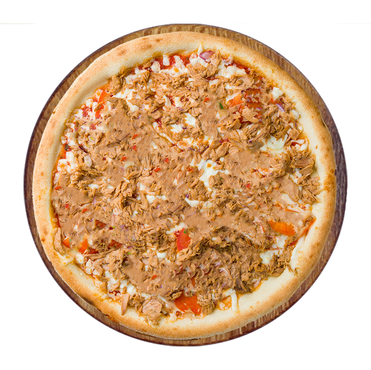 Tomate, fromage, bacon, poulet, oignons, poivrons.