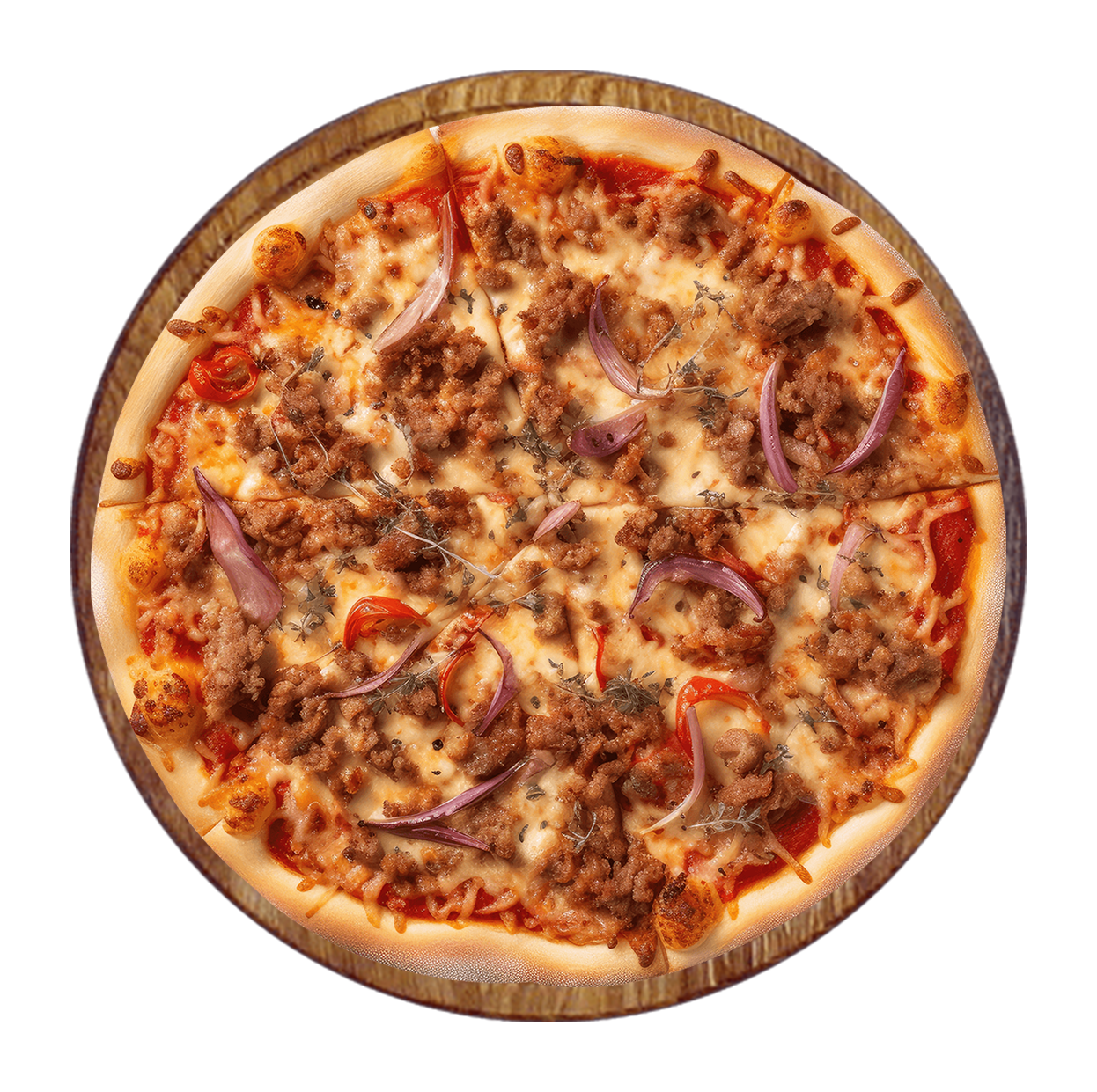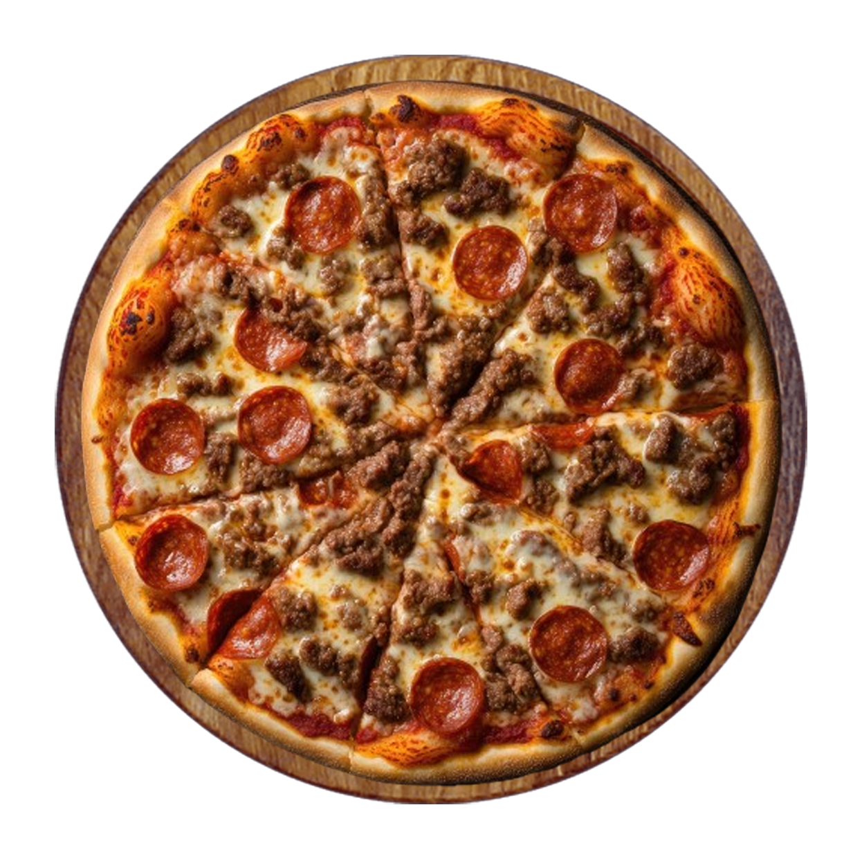 Tomate, fromage, viande hachée, pepperoni, cheddar.