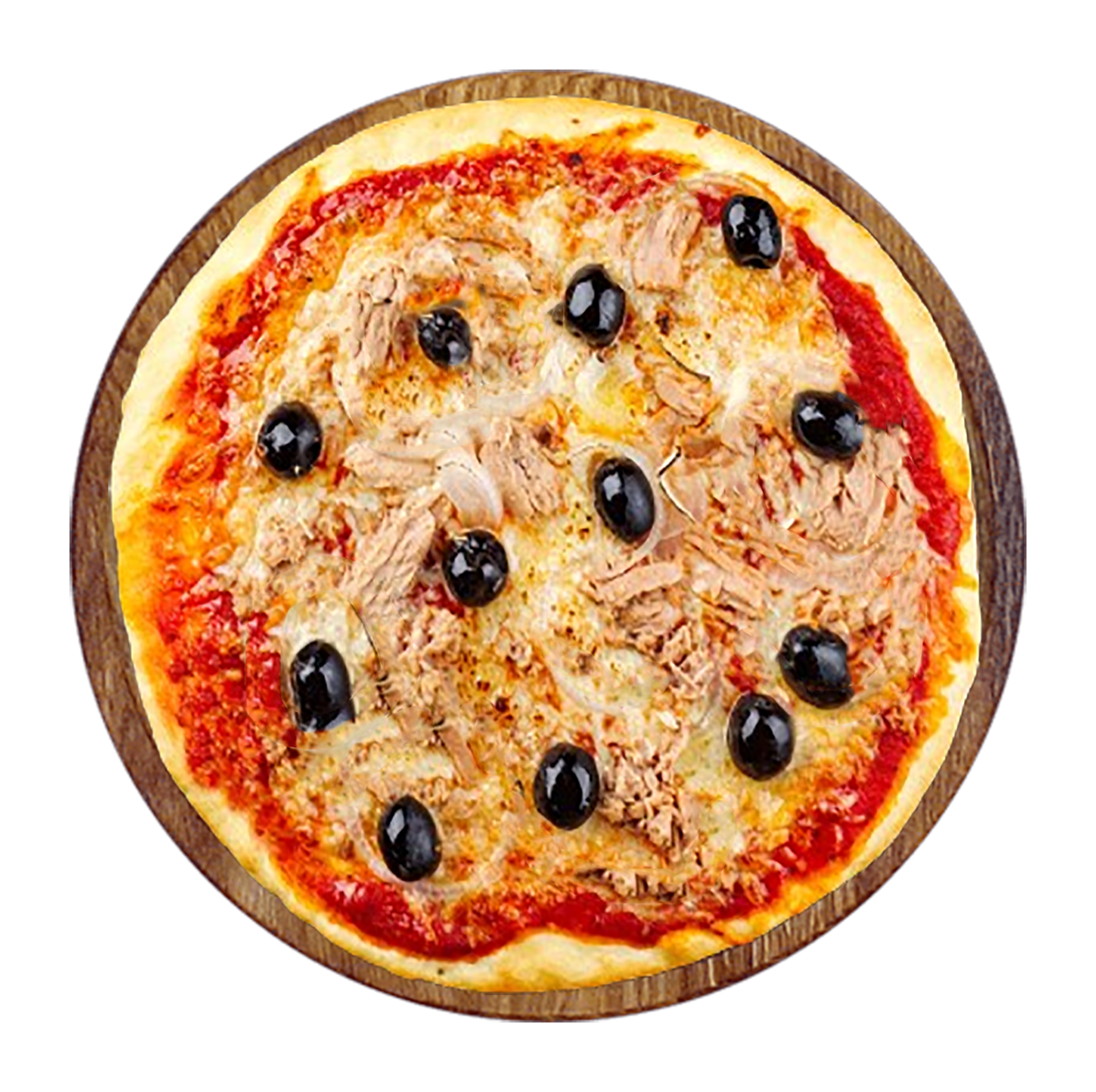 Tomate, fromage, thon, champignons, olives.
