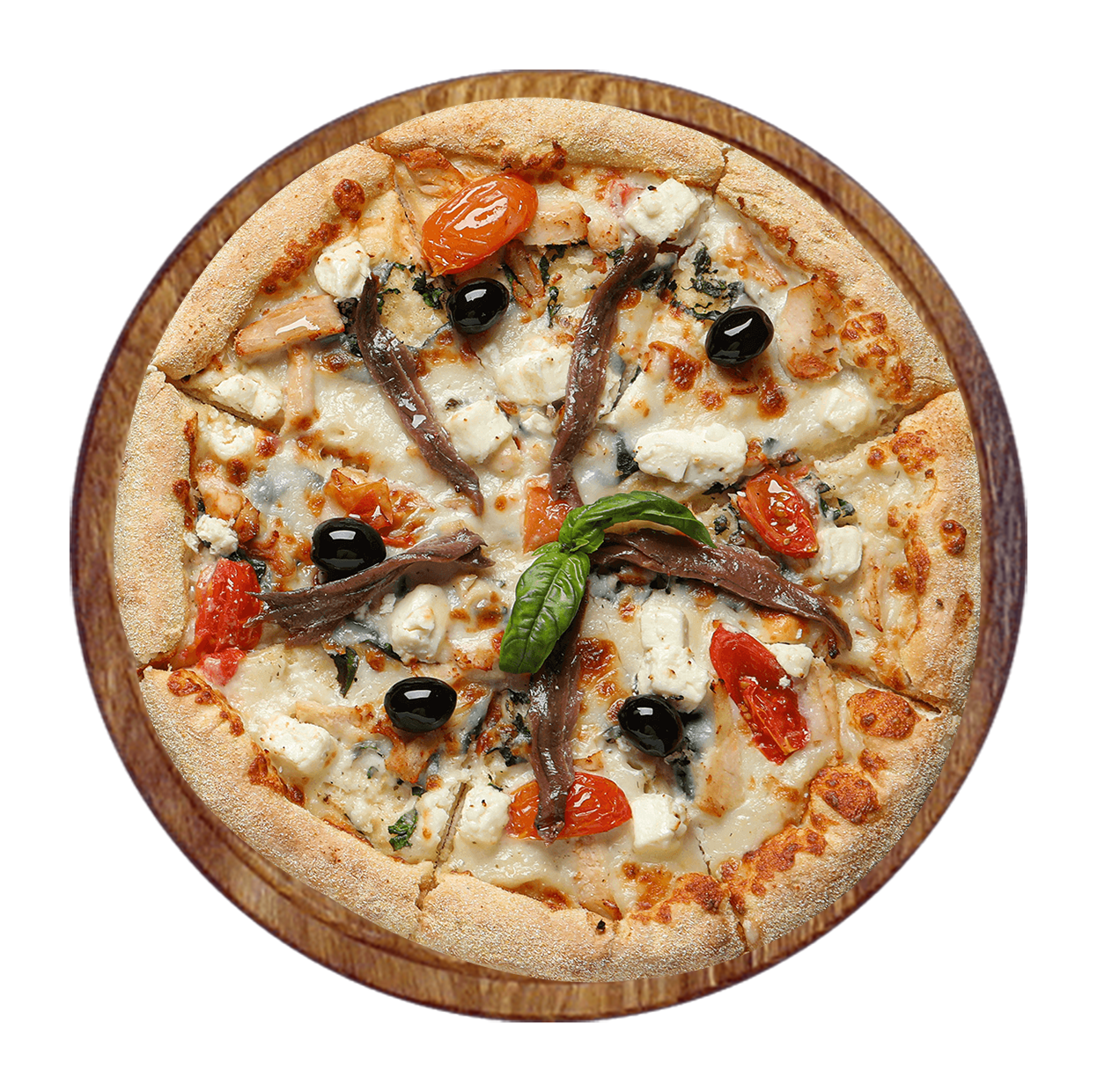 Tomate, fromage, anchois, câpres, olives.