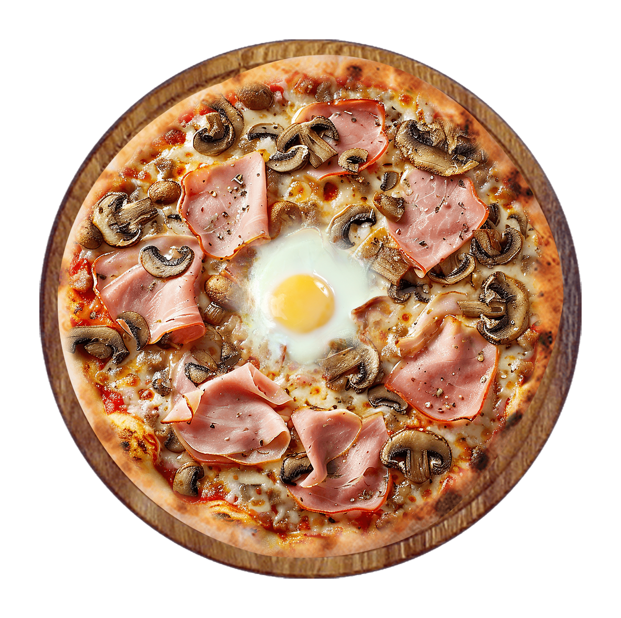 Tomate, fromage, jambon, champignons, olives, oeuf.