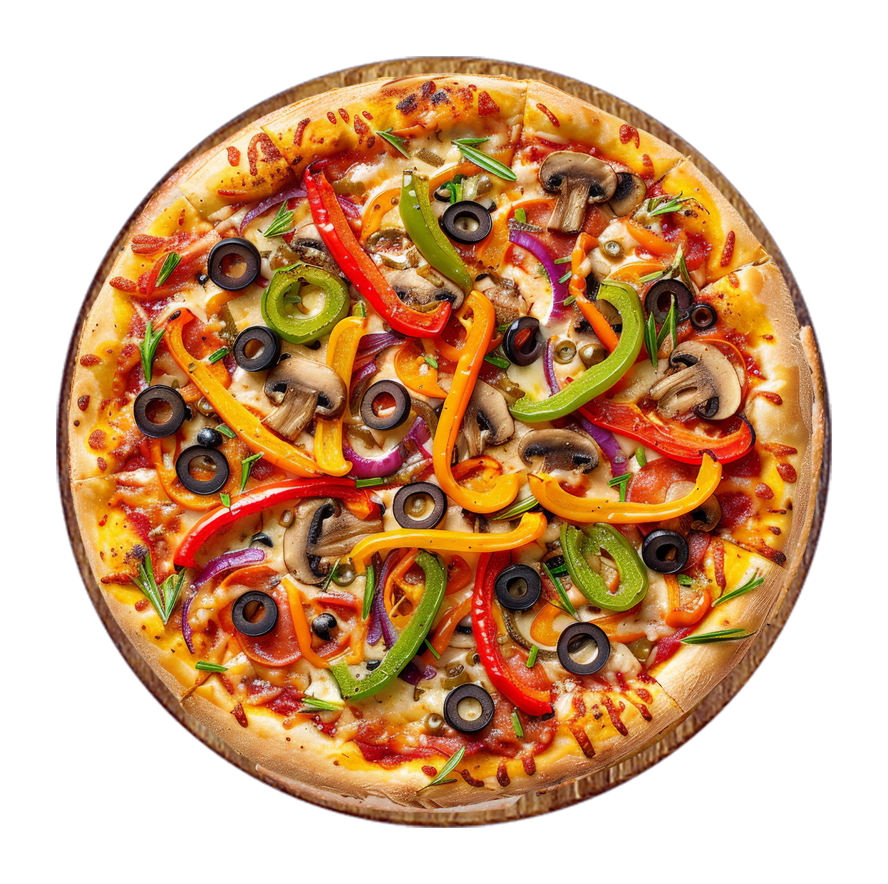 Tomate, fromage, champignons, poivrons, olives.