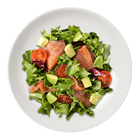 Salade, tomates, saumon, avocat, citron, vinaigrette.