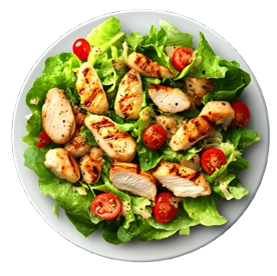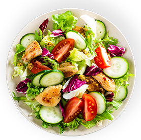 Salade, tomates, poulet, chèvre, cornichons, vinaigrette.
