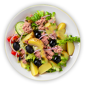 Salade, tomates, thon, olives, pommes de terre, vinaigrette.