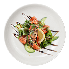 Salade, tomates, saumon fumé, avocat, olives.