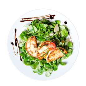 Salade, tomates, poulet, olives, chèvre, croûtons.