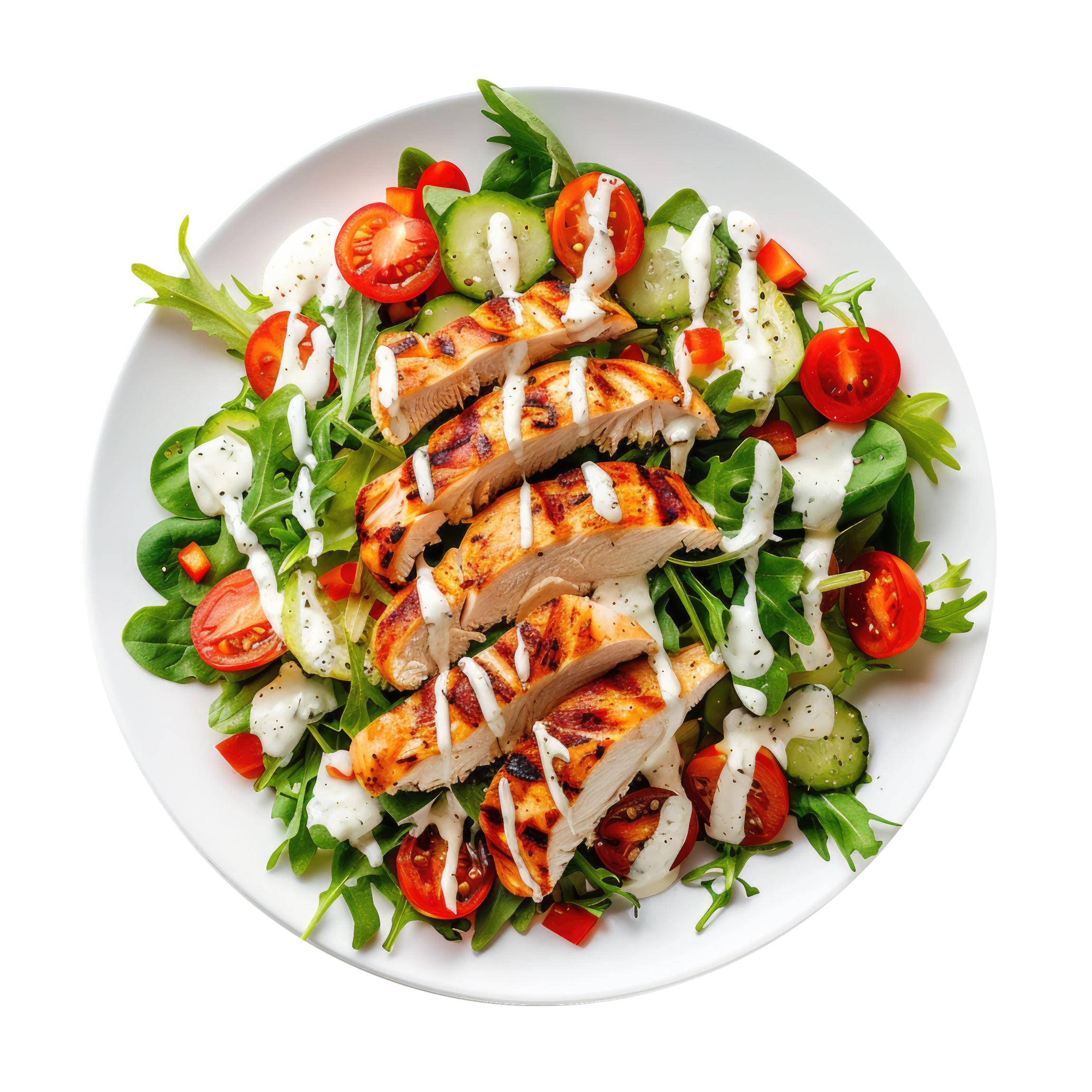 Salade, tomates, poulet, olives, mozzarella.