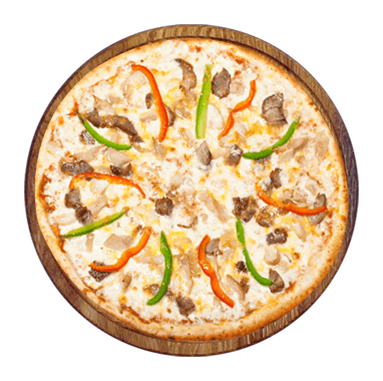Sauce curry, double fromage, poulet, lardons, poivrons.