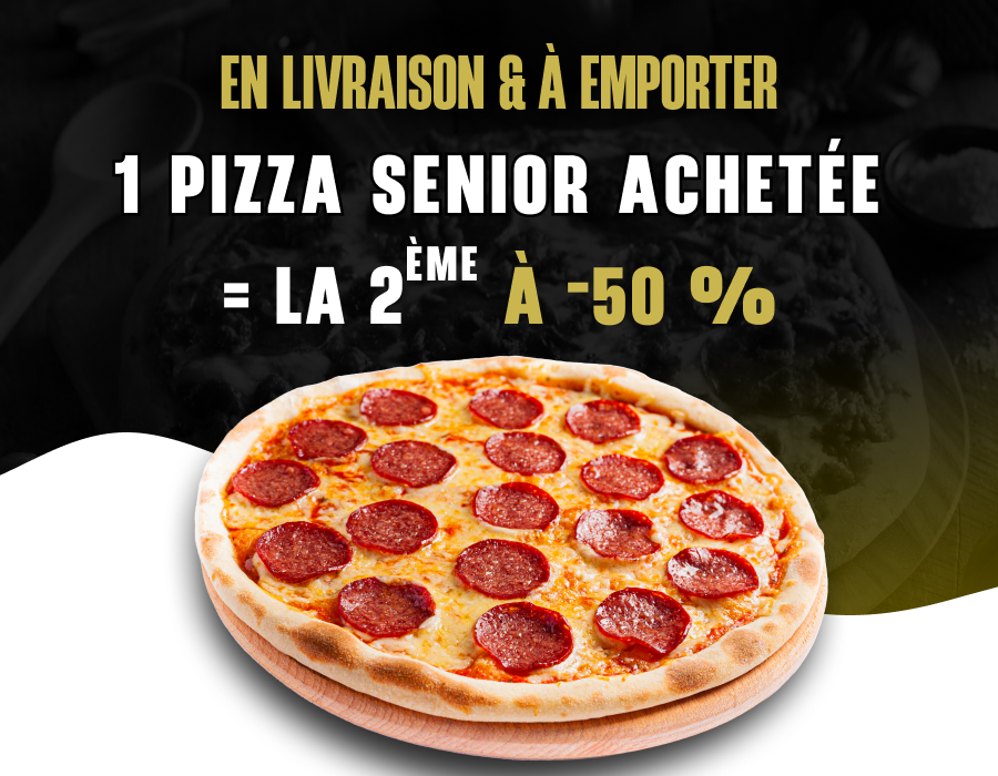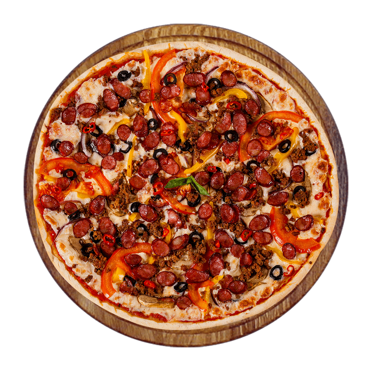 Sauce tomate, double fromage, viande hachée, merguez, poivrons, olives.
