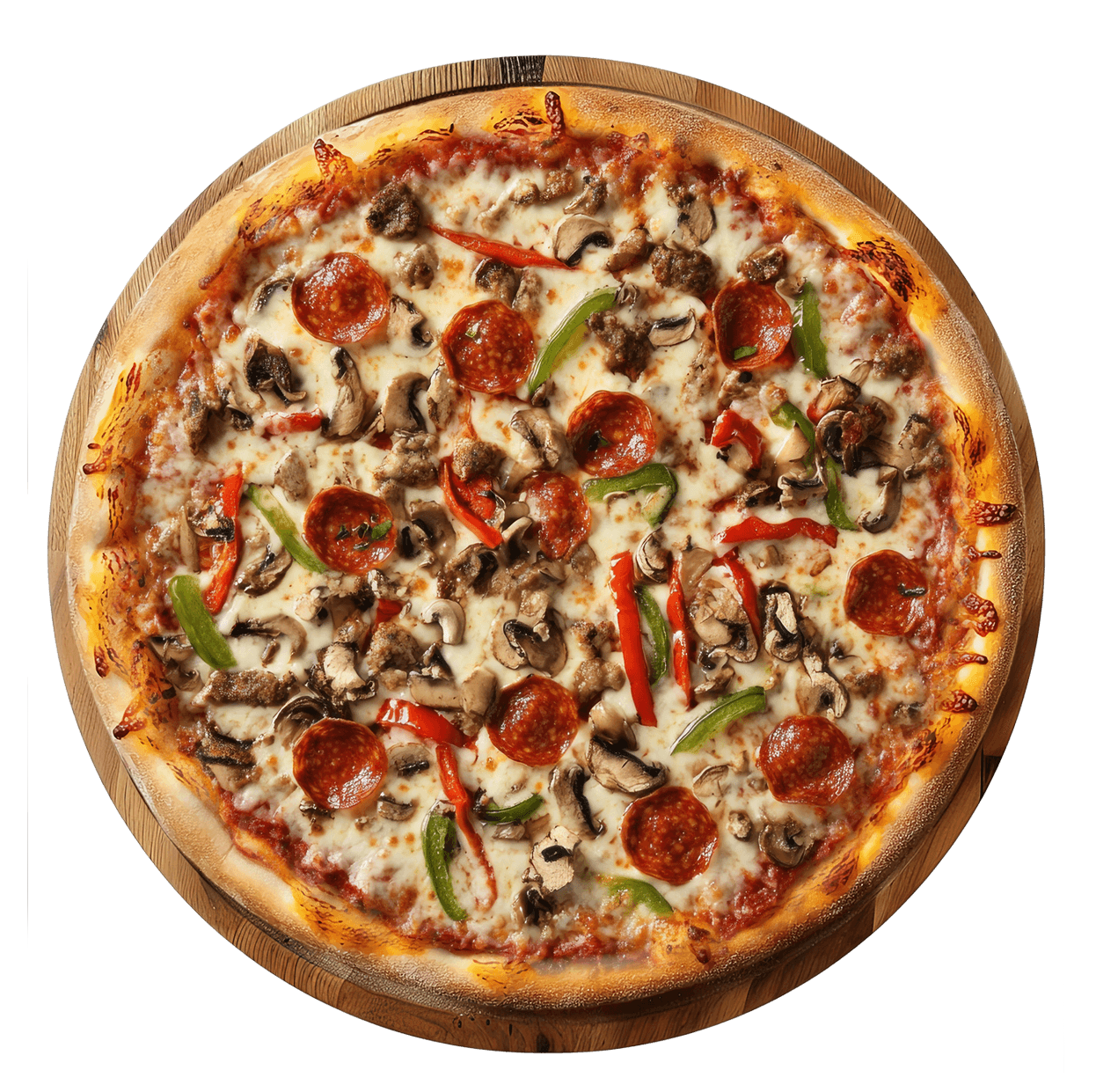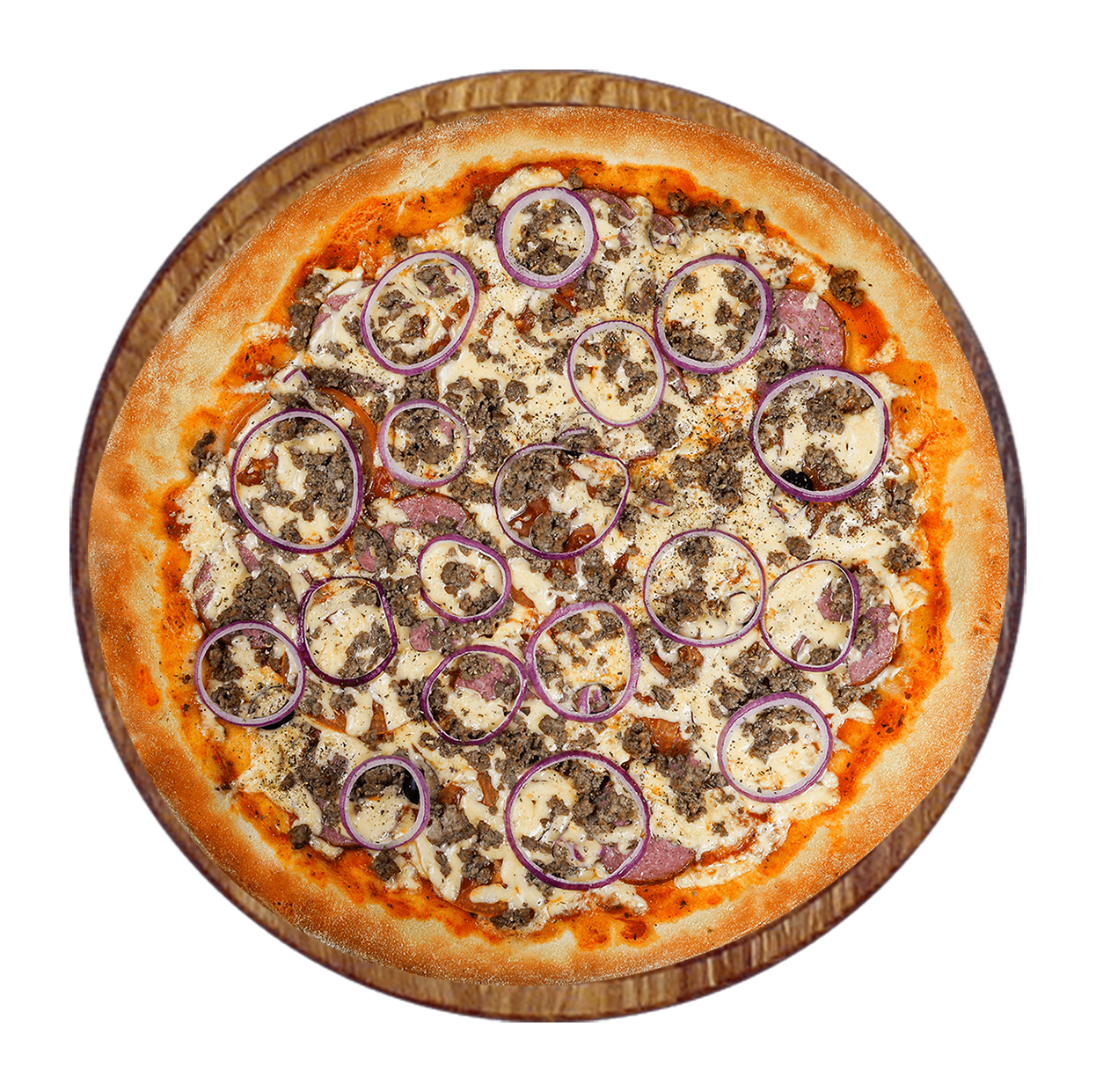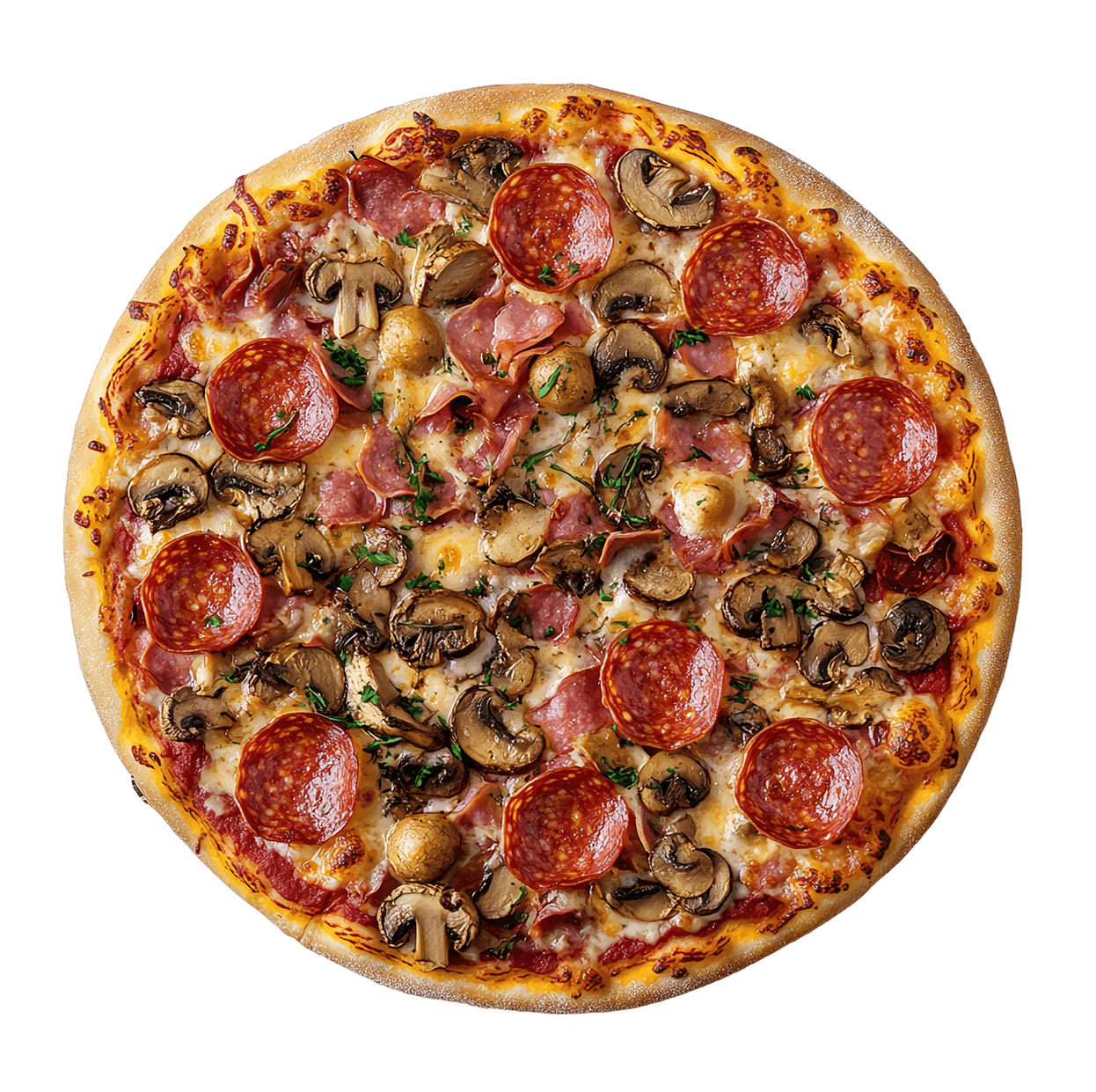 Sauce tomate, double fromage, jambon, viande hachée, chorizo, champignons.