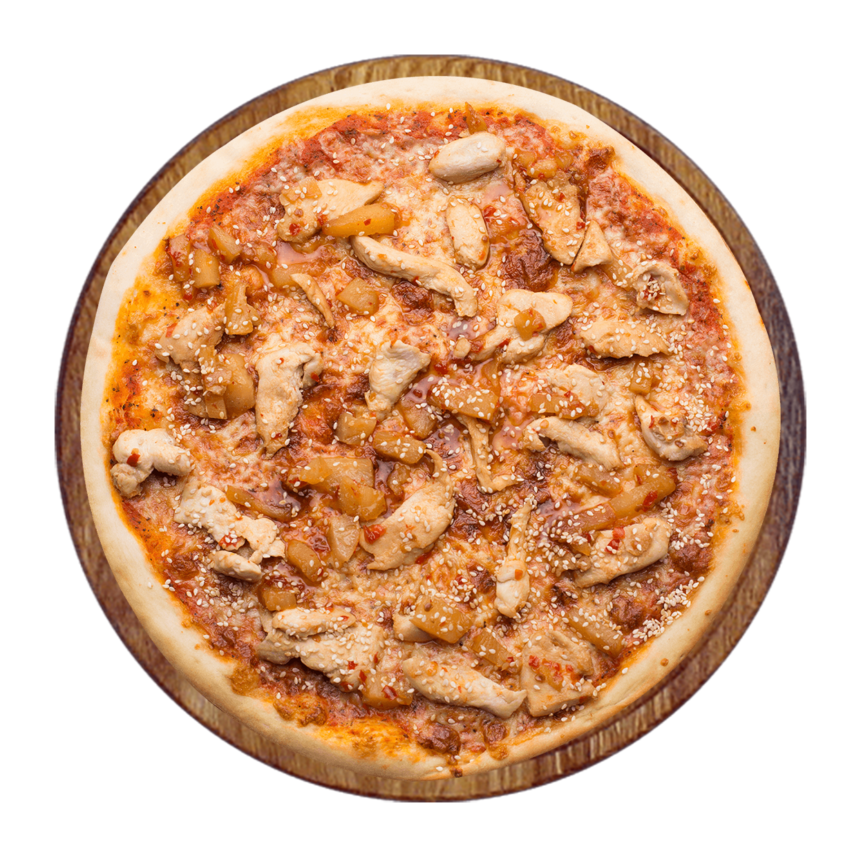Sauce tomate, double fromage, viande hachée, poulet, chorizo, oignons.