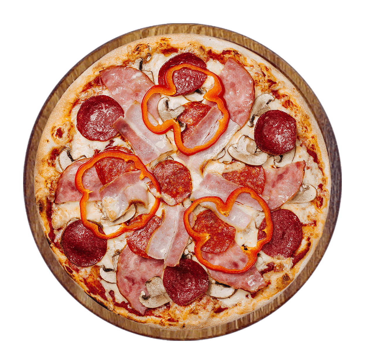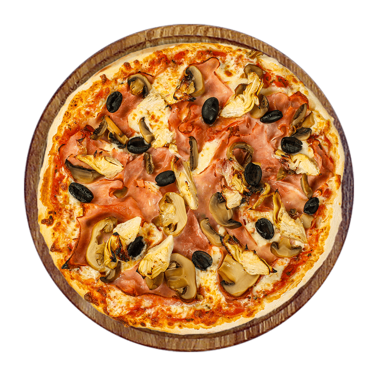Sauce tomate, double fromage, jambon, champignons, poivrons, olives.